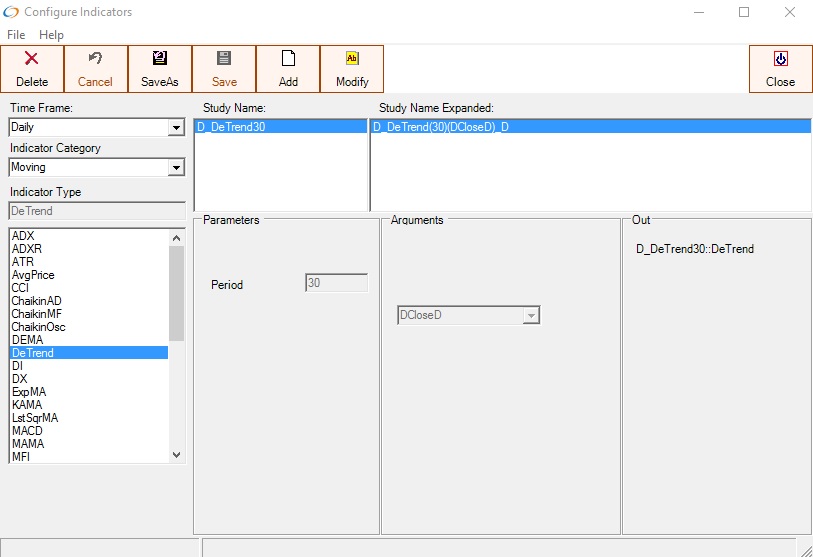 The De-trended Price first calculates a regression line for a time series, then subtracts the slope of the line from the price. By removing the trend from the time series, the result is a series of detrended prices. It has the effect of flattening out the trend to make oscillations more visible.