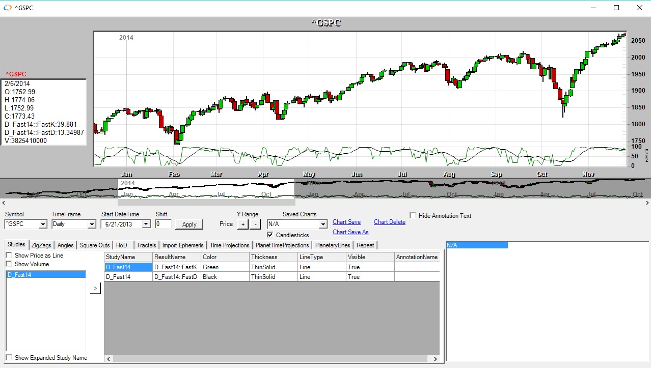 Fast Stochastic on the Daily Timeframe, with a KPeriod of 14, DPeriod of 14