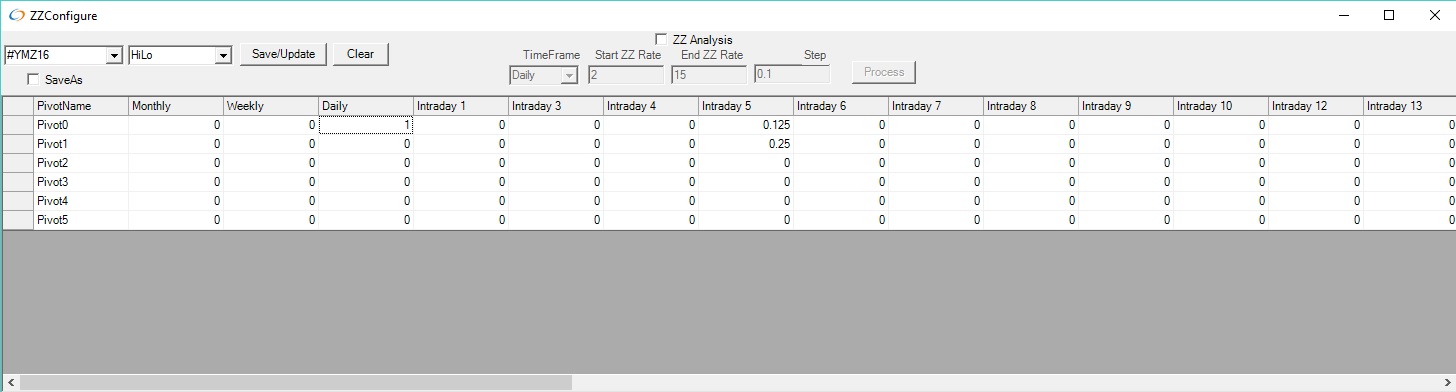 The ZZConfigure window can configure ZigZags on multiple timeframes.  Three different types of ZigZags can be configured, HiLo, Cl(Close), and SqrtRtRng(Square Root Range).  Up to 6 ZigZags can be specified on each timeframe.