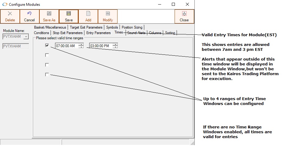 The Times Tab allows you to configure valid entry times for a module. While alerts will appear in the Module window whenever the conditions configured in the Conditions Tab are true, the alert(s) will not be sent to KATP unless it is in one of the valid Time Ranges Configured .