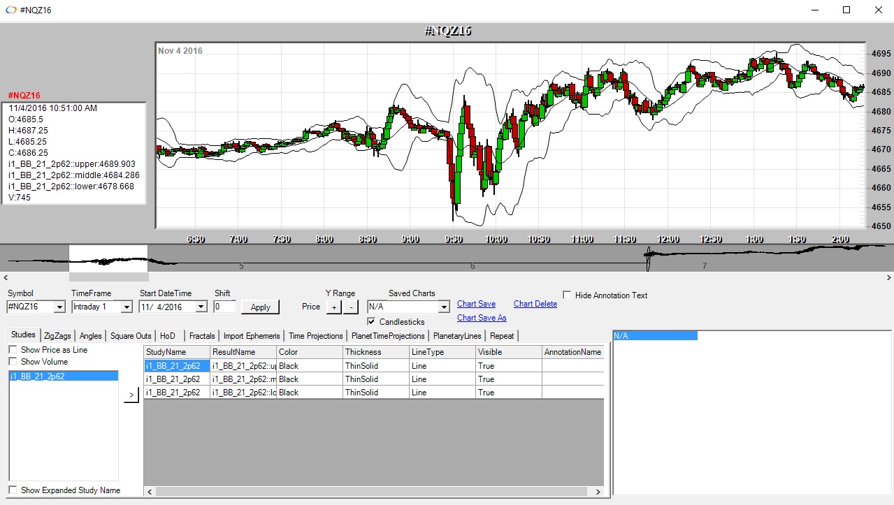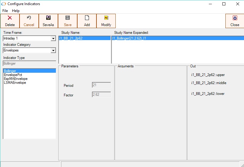 The Bollinger band indicator with a period of 21 and a factor of 2.62 on the minute timeframe.
