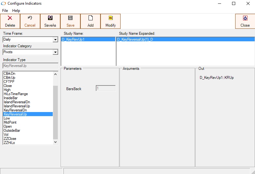 A Key Reversal Up occurs when Current Bar Low < prev Bar Low and Current Bar Close > Prev Bar Close. It returns a 1 if it's an KeyReversalUp Bar, 0 Otherwise.
