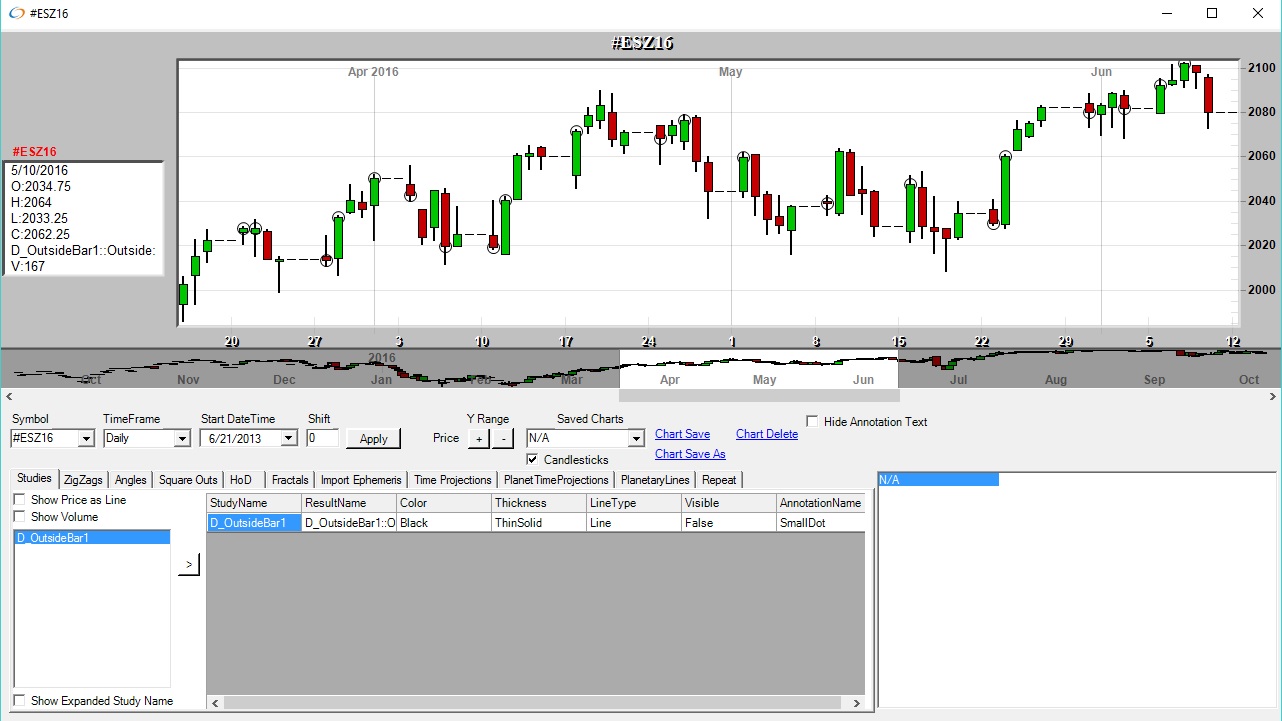 Above is a chart of the OutsideBar indicator on the daily timeframe.  The bars with a circle annotation are the Outside bars.