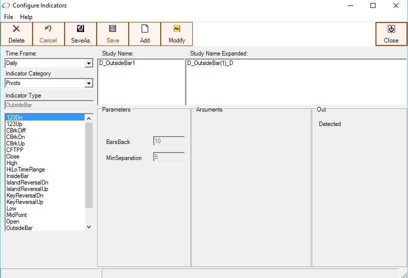 This indicator detects whether the current Bar is an outside Bar. It returns a 1 if it's an Outside Bar, 0 Otherwise.