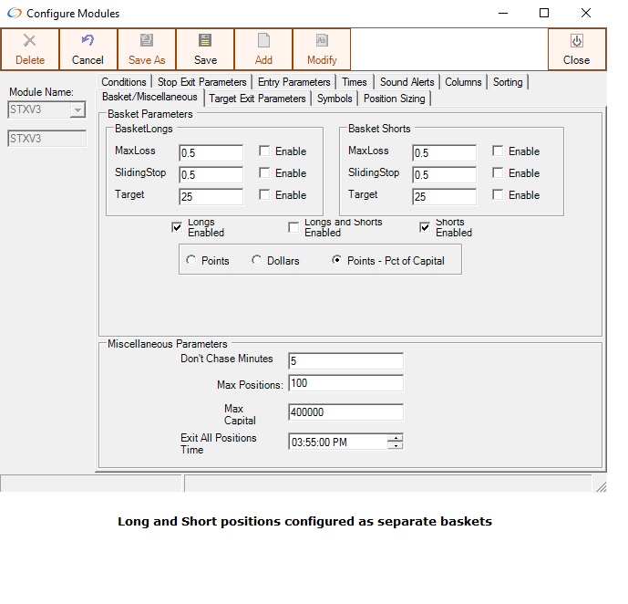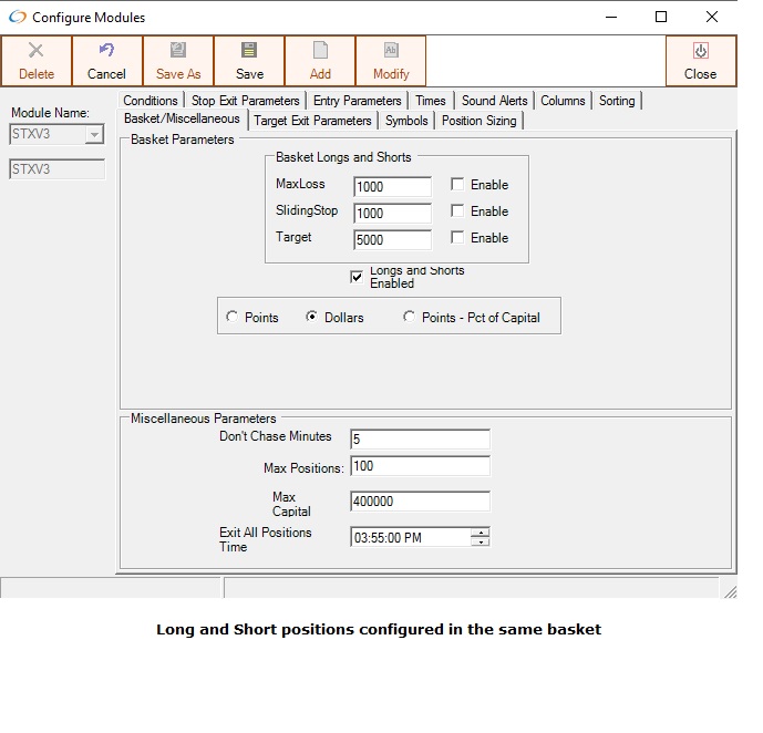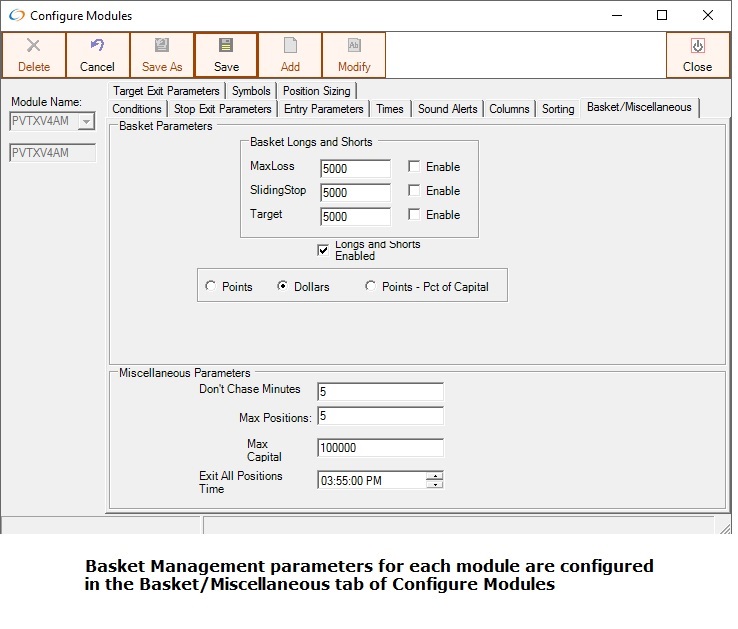 The basket settings are similar to the stop and target settings for each symbol, but are applied globally to the module, in order to preserve gains or limit losses for the entire module.