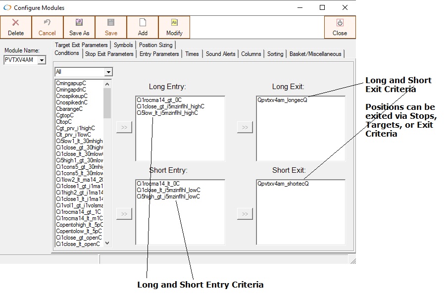 When the conditions in the Long Entry and Short Entry boxes are met, the symbol is sent to KATP for execution. When the conditions in the Long Exit or Short Exit boxes are met, the positions are exited. Positions are also exited when stops or targets are hit.