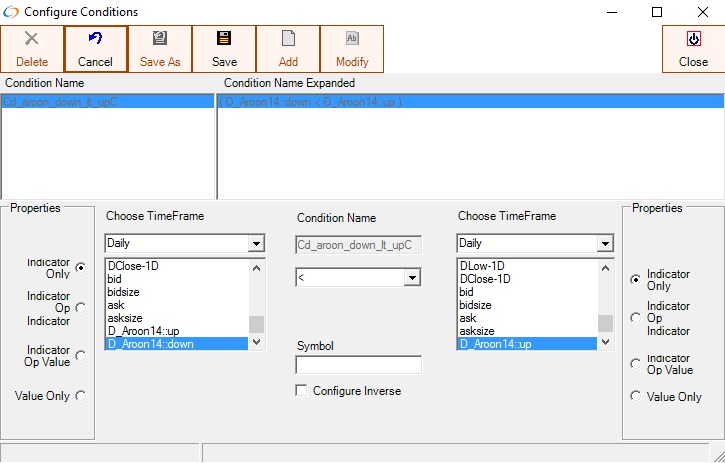 The Aroon indicator attempts to show when a new trend is beginning. The indicator consists of two lines (Up and Down) that measure how long it has been since the highest high/lowest low has occurred within an n period range.