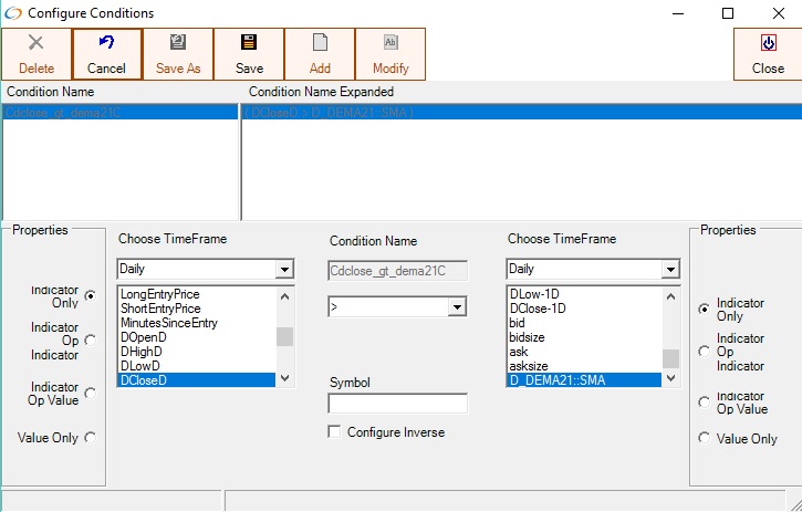 The Double Exponential Moving Average(DEMA) can be used in conditions