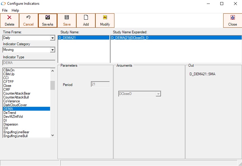 Configuring a 21 period Double Exponential Moving Average ( DEMA)