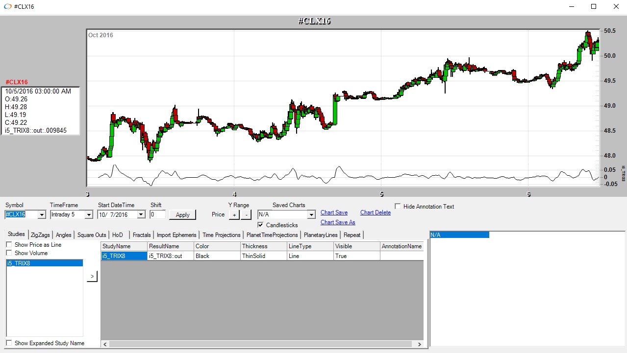 The TRIX indicator calculates the 1 day rate of change of a triple exponential moving average. The values oscillate around zero. Buy/sell signals are generated when the TRIX crosses above/below zero. An exponential moving average of the TRIX can be used as a signal line. A buy/sell signals are generated when the TRIX crosses above/below the signal line and is also above/below zero.