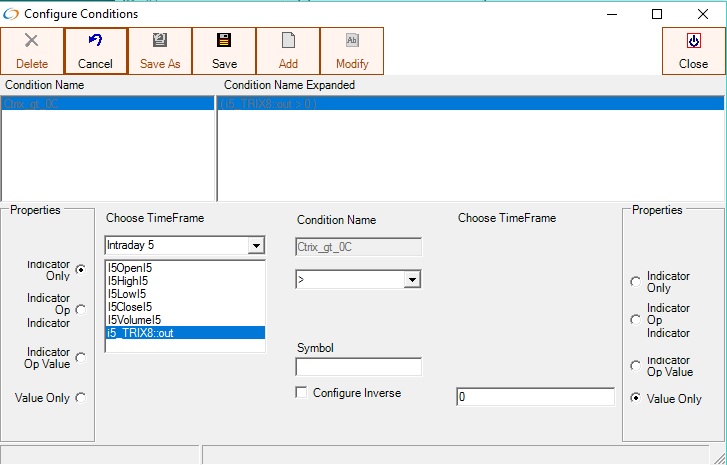 The TRIX indicator can be used in conditions