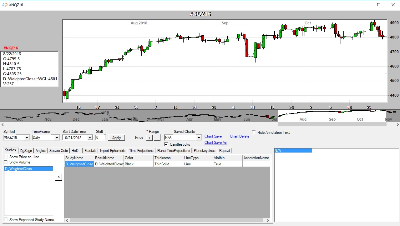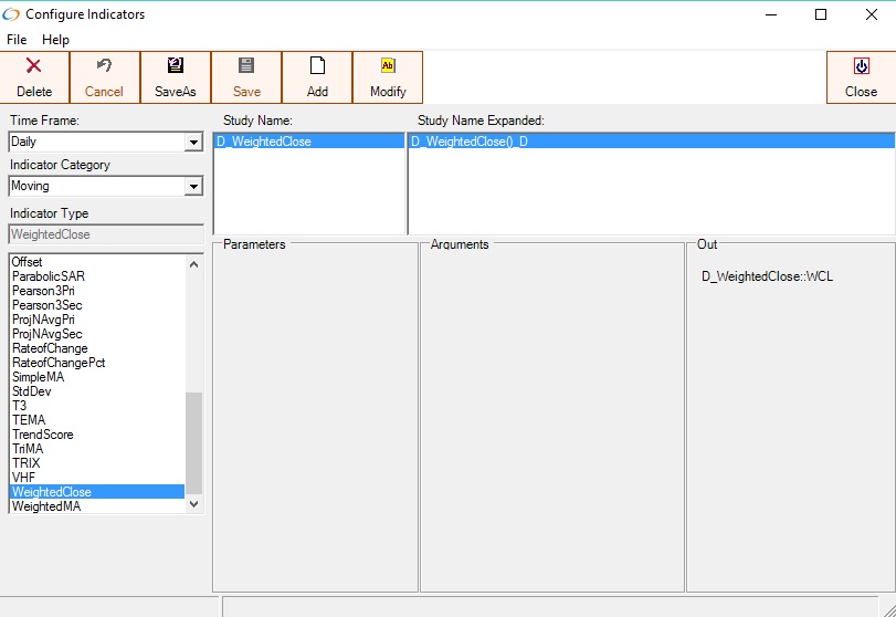 The Weighted Close is the average of the high, low and close of a bar, but the close is weighted, actually counted twice. It is used in the calculation of several indicators. It can be used to smooth an indicator that normally takes just the closing price as input. Weighted Close Price = (High + Low + (Close*2) ) / 4