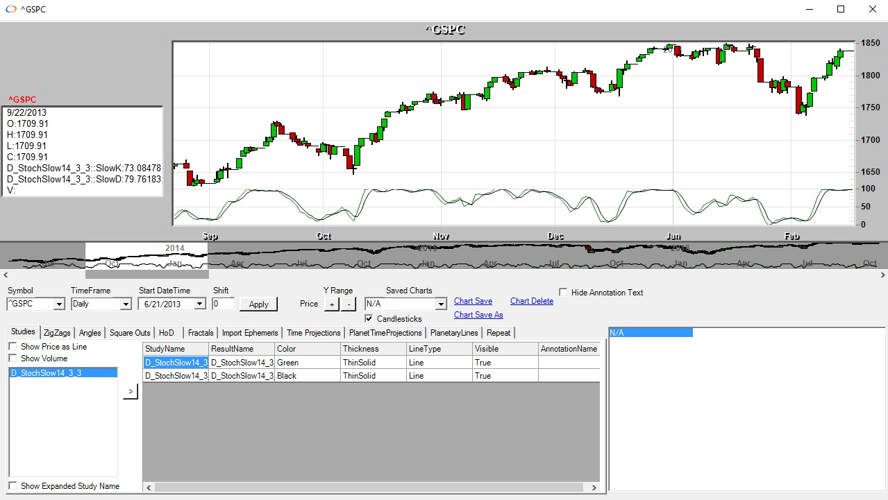 Slow Stochastics displayed on a daily chart of ^GSPC