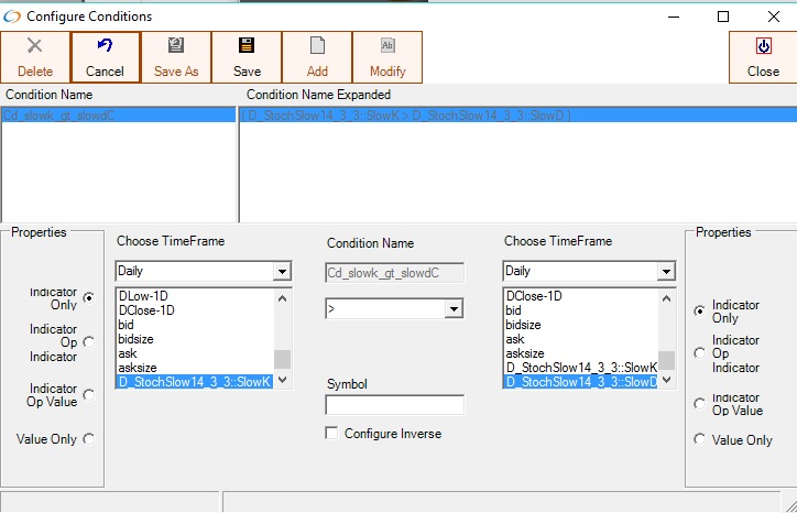 The StochSlow Indicators, SlowK and SlowD, can be used in conditions