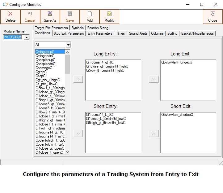 This window allows you to configure seamless automated trading systems, from entry through exit. Specify the short and long entry conditions, multiple scaleout targets, various stops, the routes for orders. Position Sizing can be configured, as well as specifying particular symbols and time windows for particular trading systems.