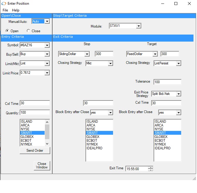 To send an order to TWS, use the Enter Positions Window. Manual or Auto positions can be sent.