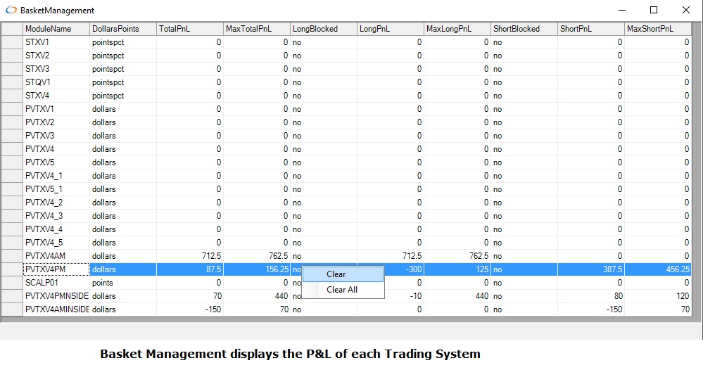 Baskets are a stop and target for the P&L of all positions in the Trading System which are in addition to the stops/targets of each symbol. A Basket can be configured for each module.