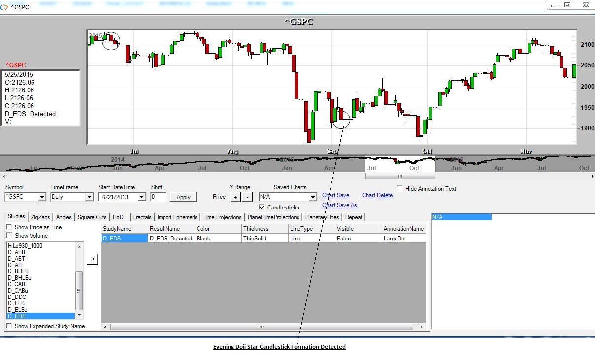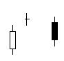 The first is a long white candlestick, the second is a Doji and the third is a small black candlestick. The Doji gaps above both the white and black candlestick. The black candlestick opens higher than the close of the white one but closes below the midpoint of the white candlestick. When this formation occurs it is a sign of a major top reversal.