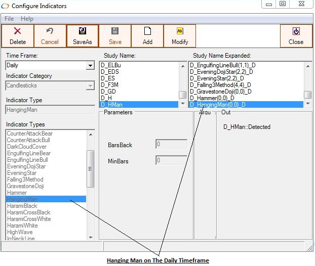 The hanging man is a candlestick that is made of a small white body with a very long lower shadow. The close is at or near the high. In an uptrend market this indicates a potential market top.