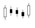 The first candlestick is long and white, it is followed by three small black bodies each of which closes lower than the prior one. All of the small black bodies hold within the range of the first white candlestick. The final candlestick is a long white body that closes at a new high.In an uptrend this a bullish continuation pattern showing that the bears tried to stop the uptrend but were unsuccessful.