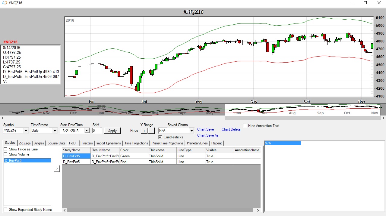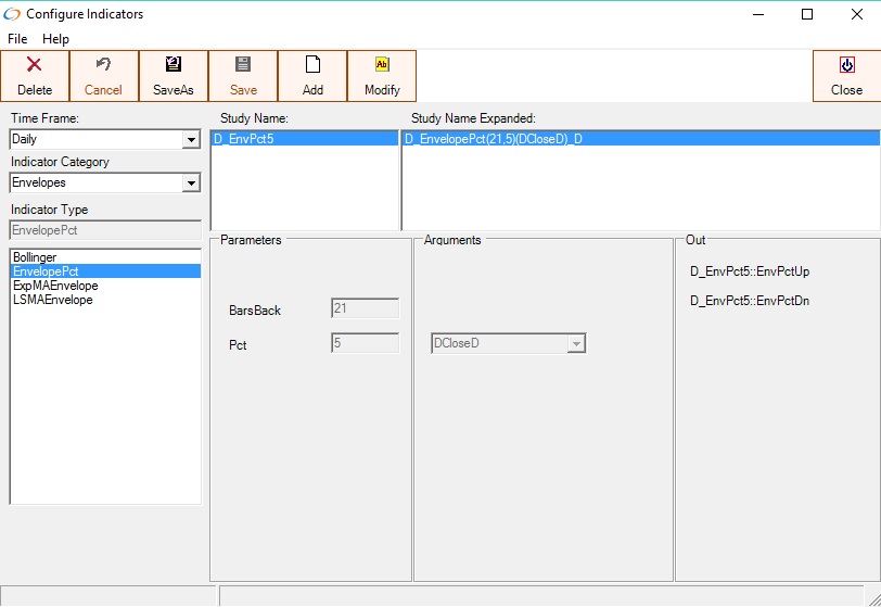 The Envelope Percent indicator creates plus and minus bands around series of numbers, based on a percentage of the series. A common use is creating support/resistance bands around the close.