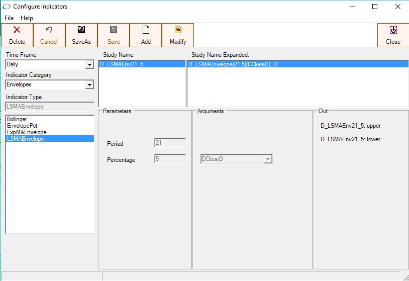 The Least Squares Moving Average Envelope indicator creates plus and minus bands around series of numbers, based on a percentage of the series. For the LSMAEnvelope, a Least Squares Moving average of the input series is used. A common use is creating support/resistance bands.