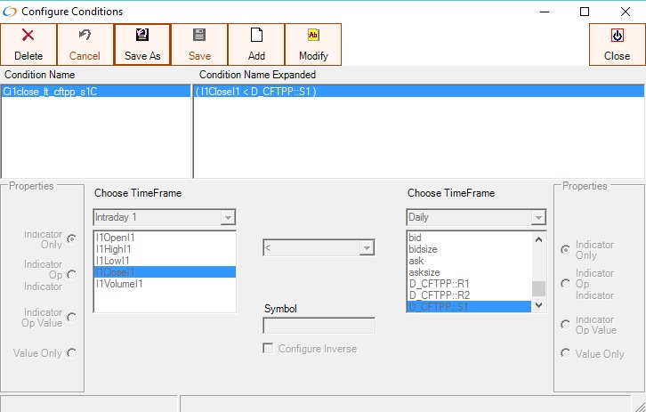 The Chicago Floor Trader Pivot Points(CFTPP) indicator can be used in conditions. The above condition tests if the 1 minute close is less than the Daily CFTPP first support level (S1)