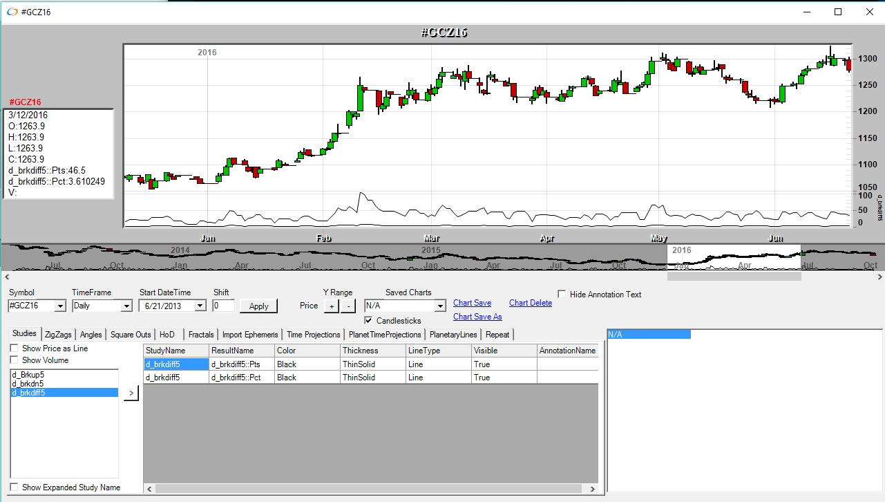 d_CBrkDiff is configured to calculate the difference of the high and low of the last 5 bars in Points(Pts) and percentage(Pct)