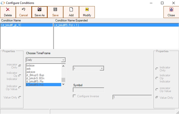 The CBrkUp, CBrkDn, and CBrkDiff indicators can be used in conditions. The condition shown is a consolidation Break Difference of the last 5 bars is greater than 1 percent