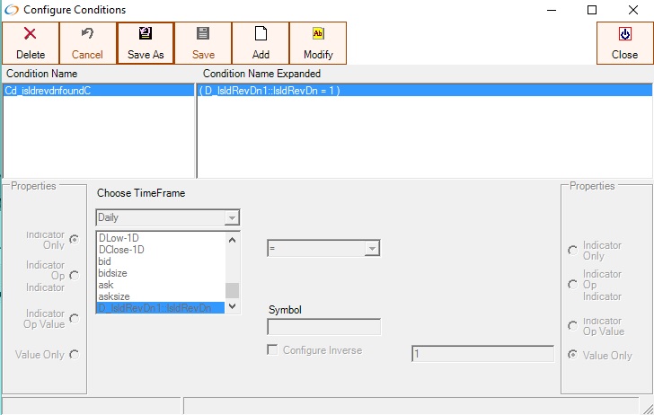 The IslandReversalDn indicator can be used in conditions. If an IslandReversalDn is detected a value of 1 is returned, otherwise a value of 0 is returned