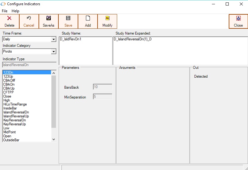 An island reversal is a chart formation where there is a gap on both sides of the candle. Island reversals frequently show up after a trending move is in its final phase The IslandReversalDn indicator returns a 1 if it's found, 0 Otherwise.