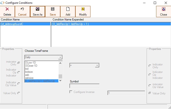 The IslandReversalUp indicator can be used in conditions. If a IslandReversalUp is detected a value of 1 is returned, otherwise a value of 0 is returned