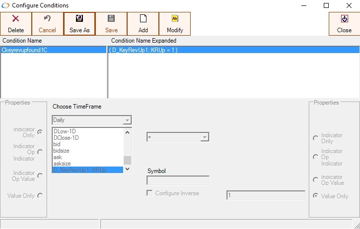The KeyReversalUp indicator can be used in conditions. If a KeyReversalUp is detected a value of 1 is returned, otherwise a value of 0 is returned