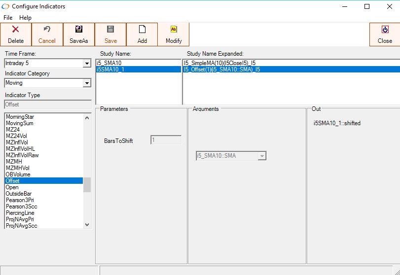 Offset is used to retrieve the previous bars of a moving indicator or bar. Use Offset indicator to retrieve previous values of indicators. Use 'Open', 'High','Low','Close', or 'Vol' indicators to retrieve previous values of the Open, High, Low, Close or Volume.