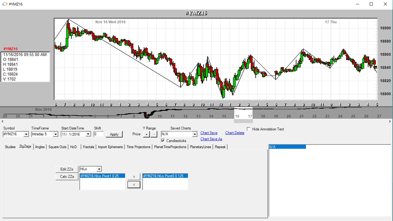 This window shows YM with HiLo ZigZags of 1% on the daily timeframe and 2 ZigZags on the Intraday 5 minute timeframe of 0.125 and 0.25 %