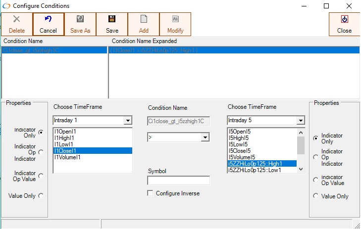Setting up ZigZags through the Configure Indicator window allows you to use ZigZag Pivots in conditions.